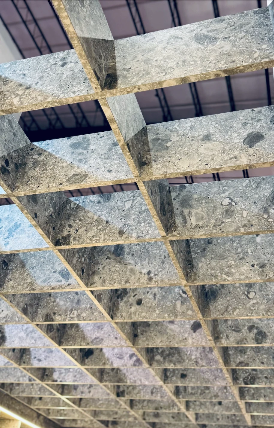 and movement to set the tone. The mirrored floor, open layout, and grid ceiling